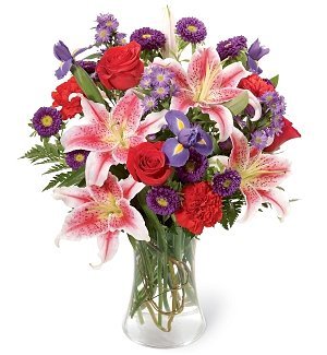Elegant Stargazer Lilies serve as the focal point in this colorful bouquet of varying shape and texture. Iris sit amongst red Roses and Carnations in this diverse bouquet that possesses both an air of elegance and playfulness. Artfully blending together both warm and passionate colors, from pink and white to red and purple, this arrangement is a masterpiece in itself. A wonderful pick-me-up, romantic, or sentimental display.